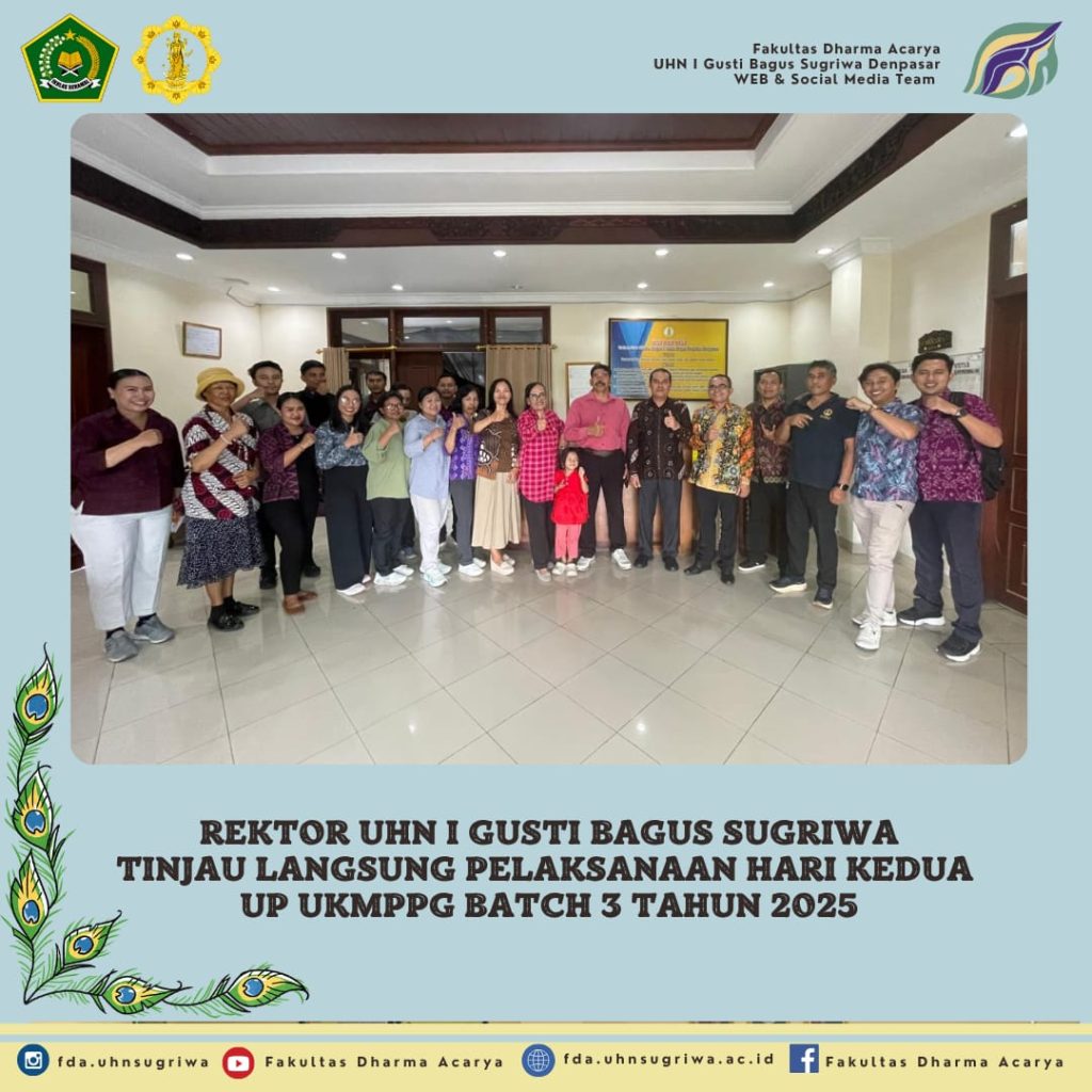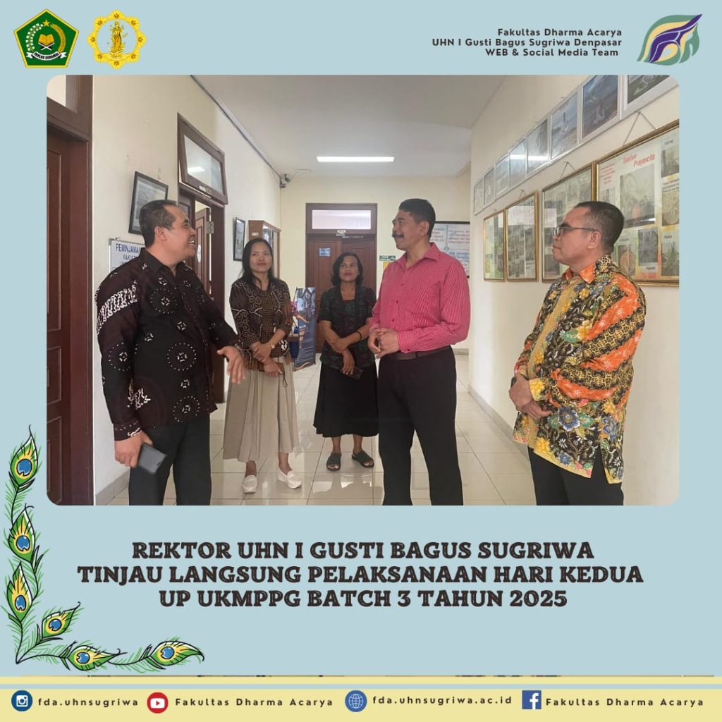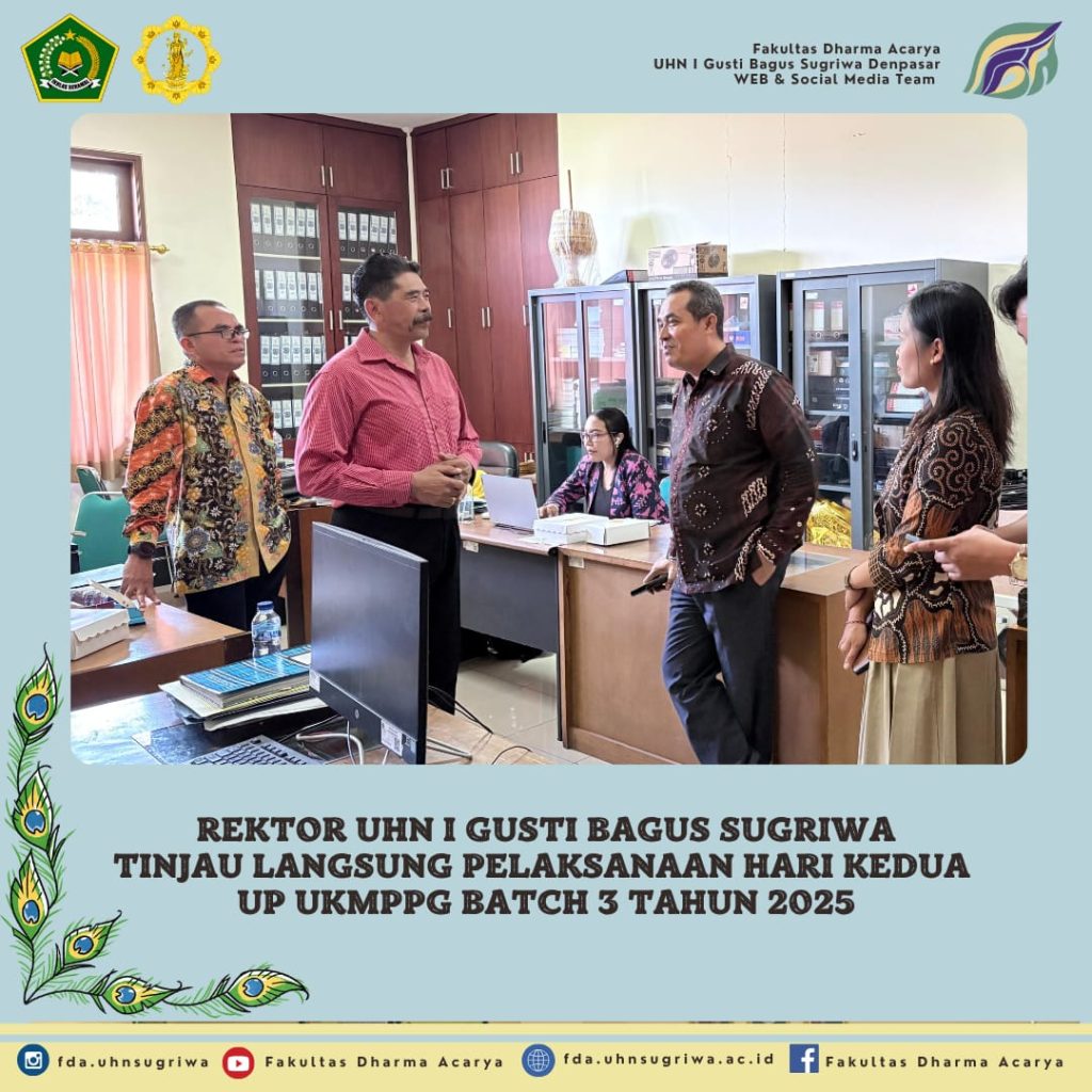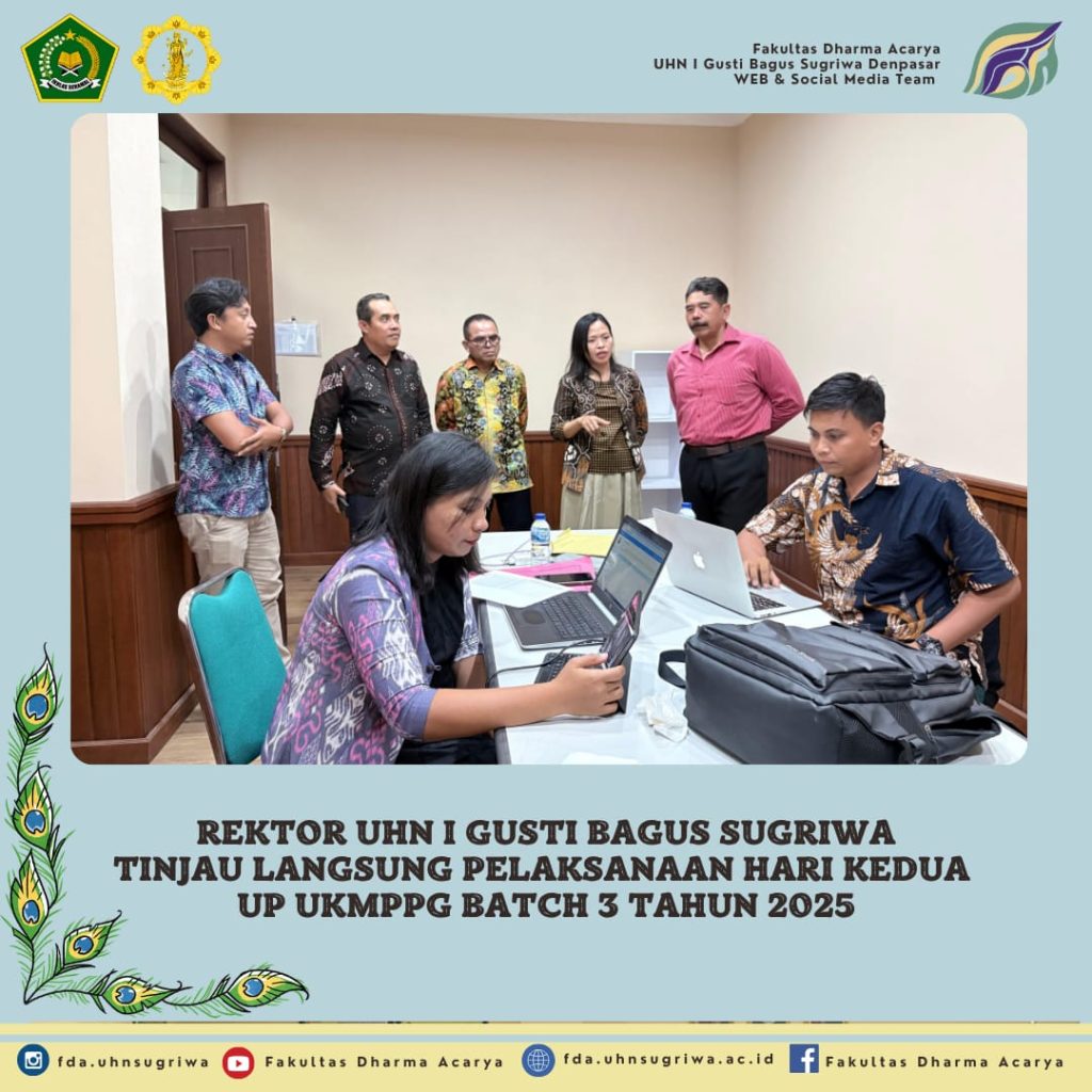 Denpasar, 19 Oktober 2025 — Rektor Universitas Hindu Negeri (UHN) I Gusti Bagus Sugriwa Denpasar Prof. Dr. Drs. I Gusti Ngurah Sudiana, M.Si melakukan peninjauan langsung terhadap pelaksanaan Uji Pengetahuan (UP) UKMPPG Dalam Jabatan Batch 3 Tahun 2025 pada hari kedua pelaksanaan ujian. Kegiatan berlangsung di Gedung Fakultas Brahma Widya, Denpasar, dan diikuti oleh 800 peserta dengan dukungan 40 pengawas.