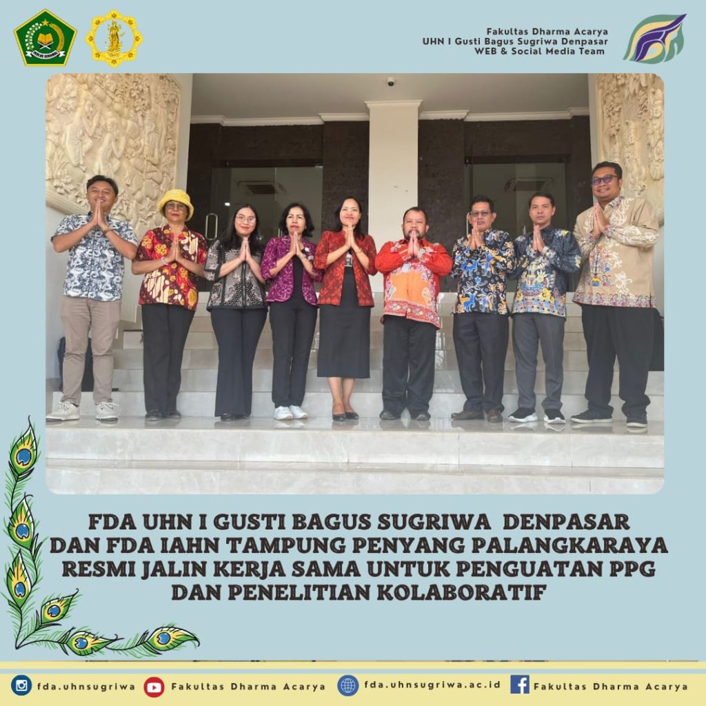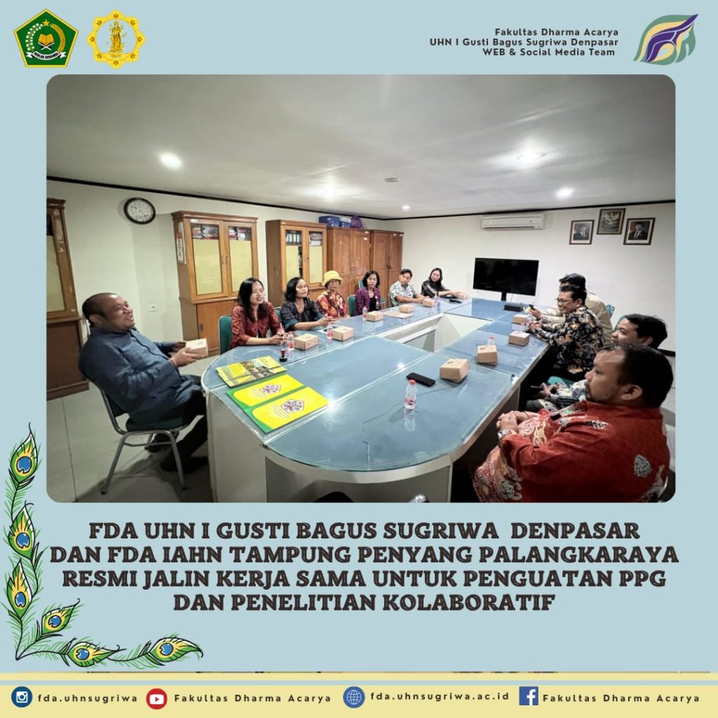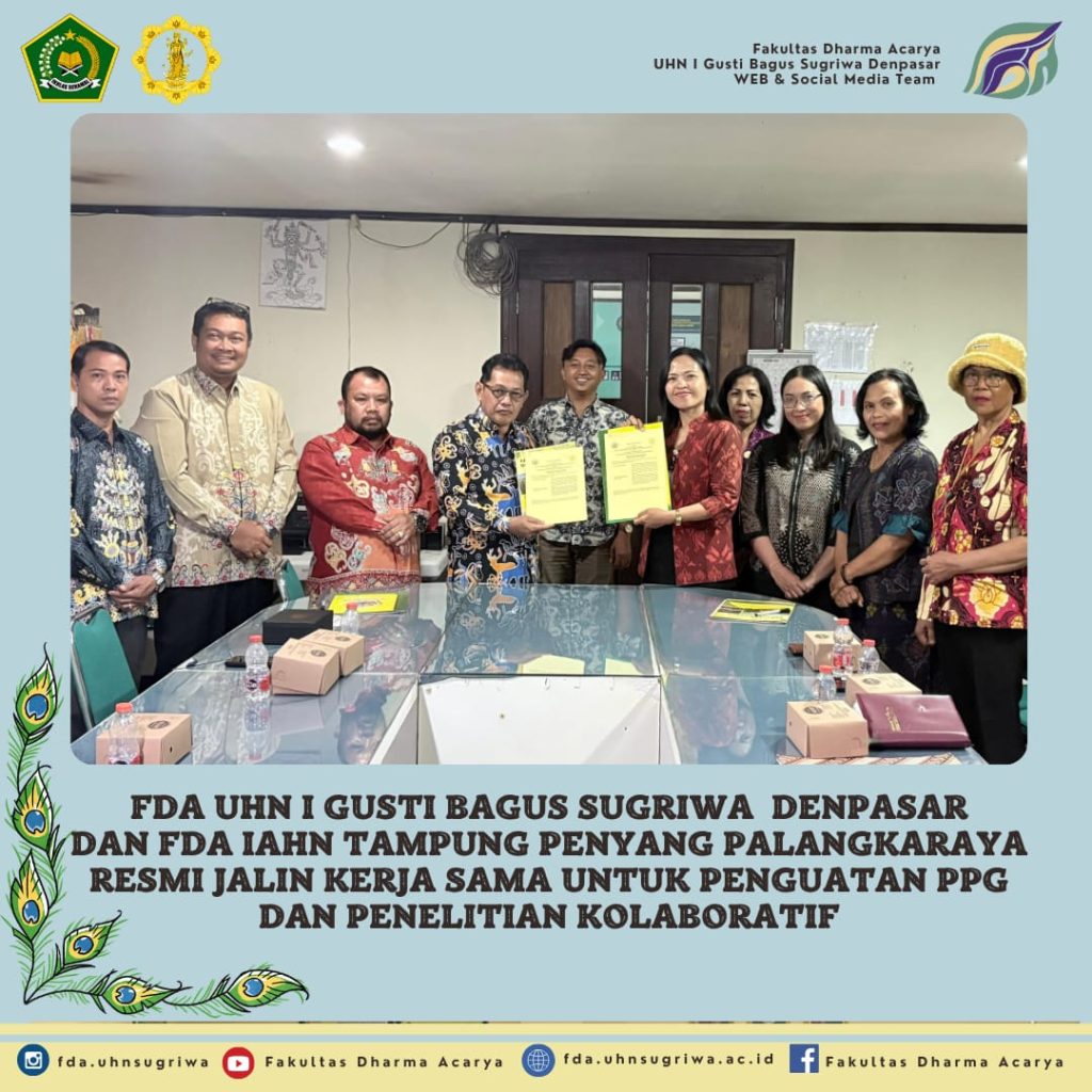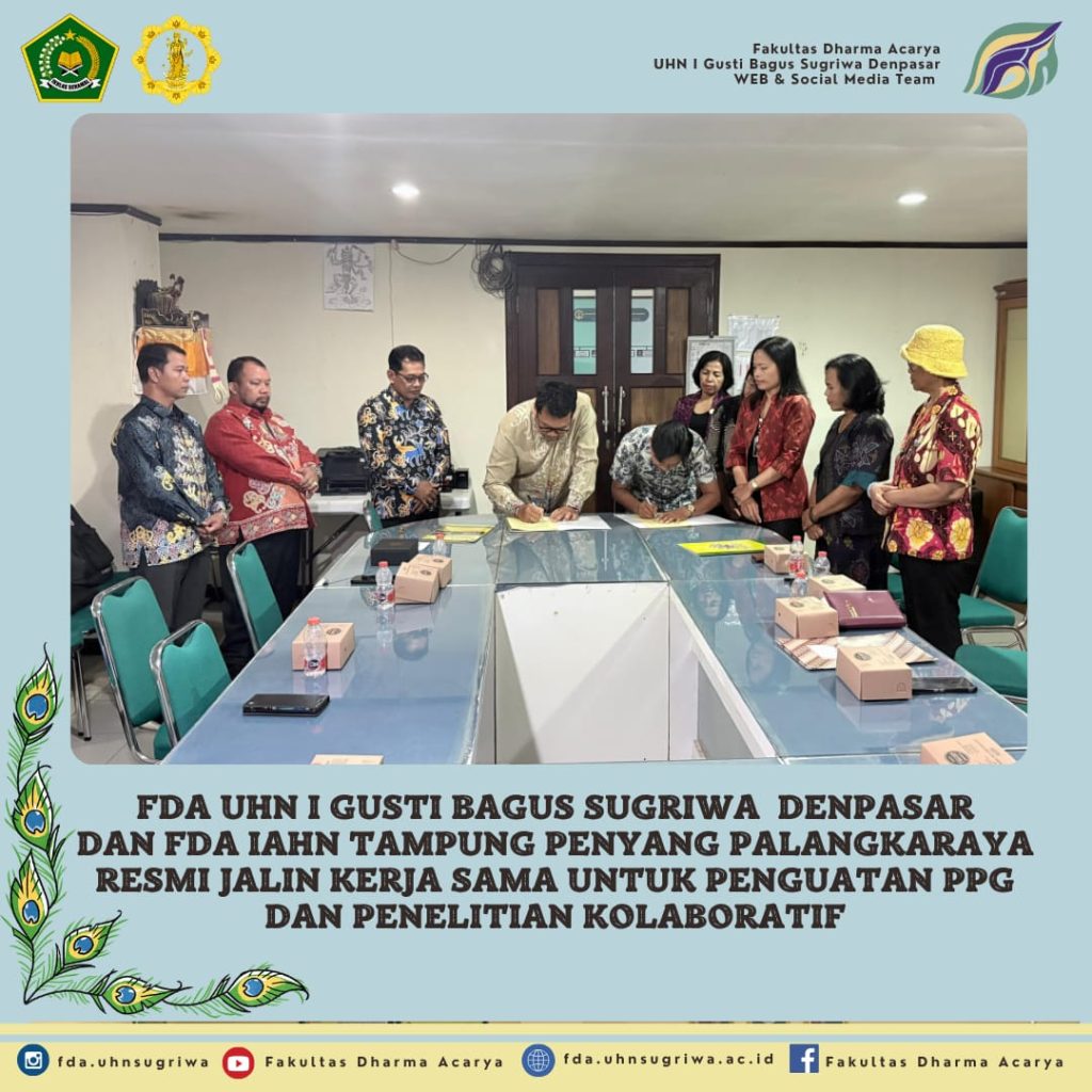 Denpasar, 29 Oktober 2025 — Fakultas Dharma Acarya (FDA) Universitas Hindu Negeri (UHN) I Gusti Bagus Sugriwa Denpasar menandatangani Perjanjian Kerja Sama (PKS) dengan Fakultas Dharma Acarya Institut Agama Hindu Negeri Tampung Penyang (IAHN-TP) Palangkaraya, Rabu (29/10). Kerja sama ini menandai komitmen kedua lembaga dalam memperkuat penyelenggaraan Program Profesi Guru (PPG) serta mengembangkan penelitian kolaboratif di lingkungan Perguruan Tinggi Keagamaan Hindu (PTKH). Dari pihak IAHN Tampung Penyang, hadir Wakil Rektor II Mitro, S.Pd.,M.si, Dekan Fakultas Dharma Acarya Dr. Derson, S.Ag.,M.Ag, Ketua Prodi PPG Dr. I Gede Dharman Gunawan, SH.,M.Pd.H dan Sekretaris Prodi PPG Serlis Rusandi, S.Pd.,M.Pd. Sementara dari UHN I Gusti Bagus Sugriwa Denpasar, turut hadir Dekan Fakultas Dharma Acarya, Wakil Dekan I, II, dan III, Ketua dan Sekretaris Prodi PPG, serta Kepala Bagian Tata Usaha FDA.