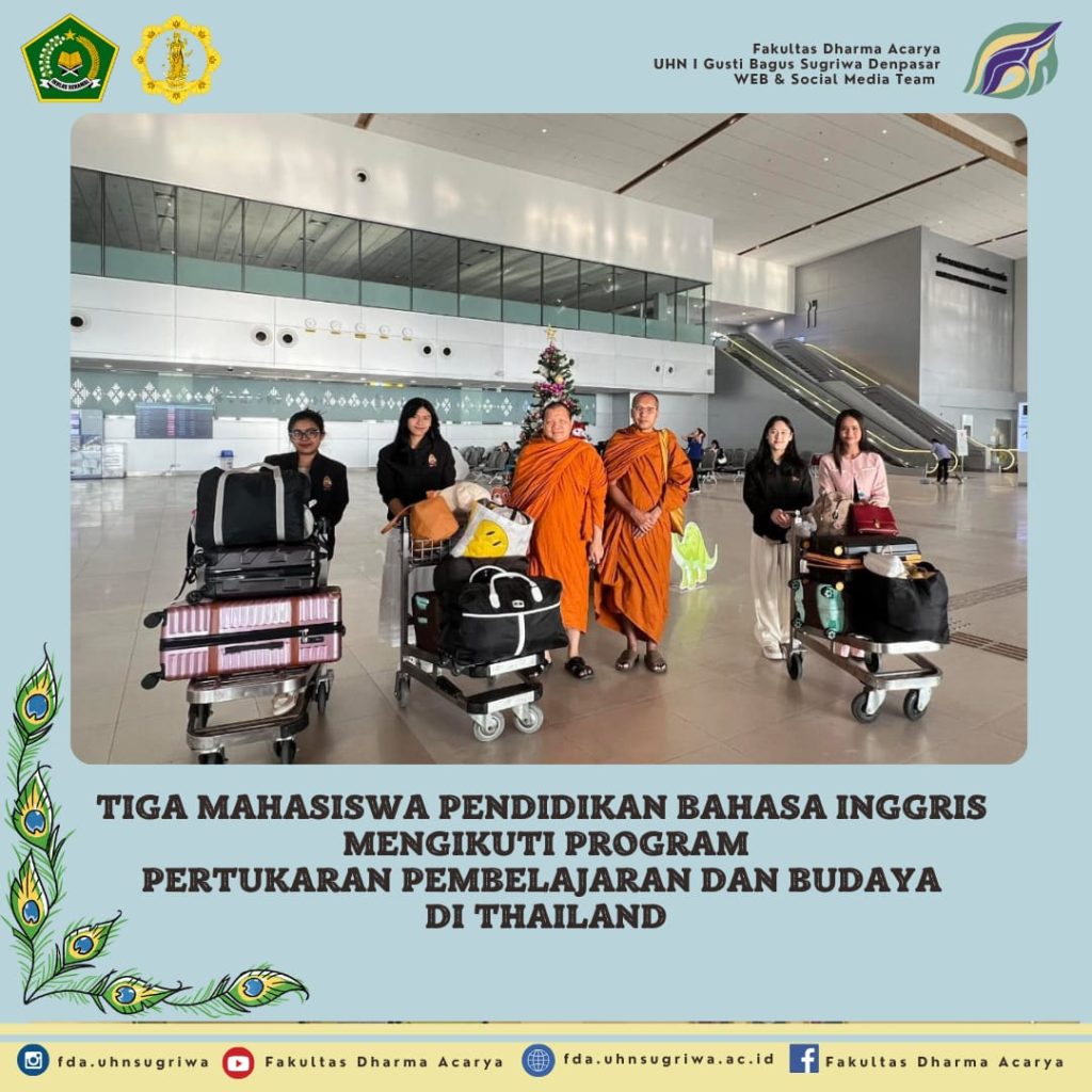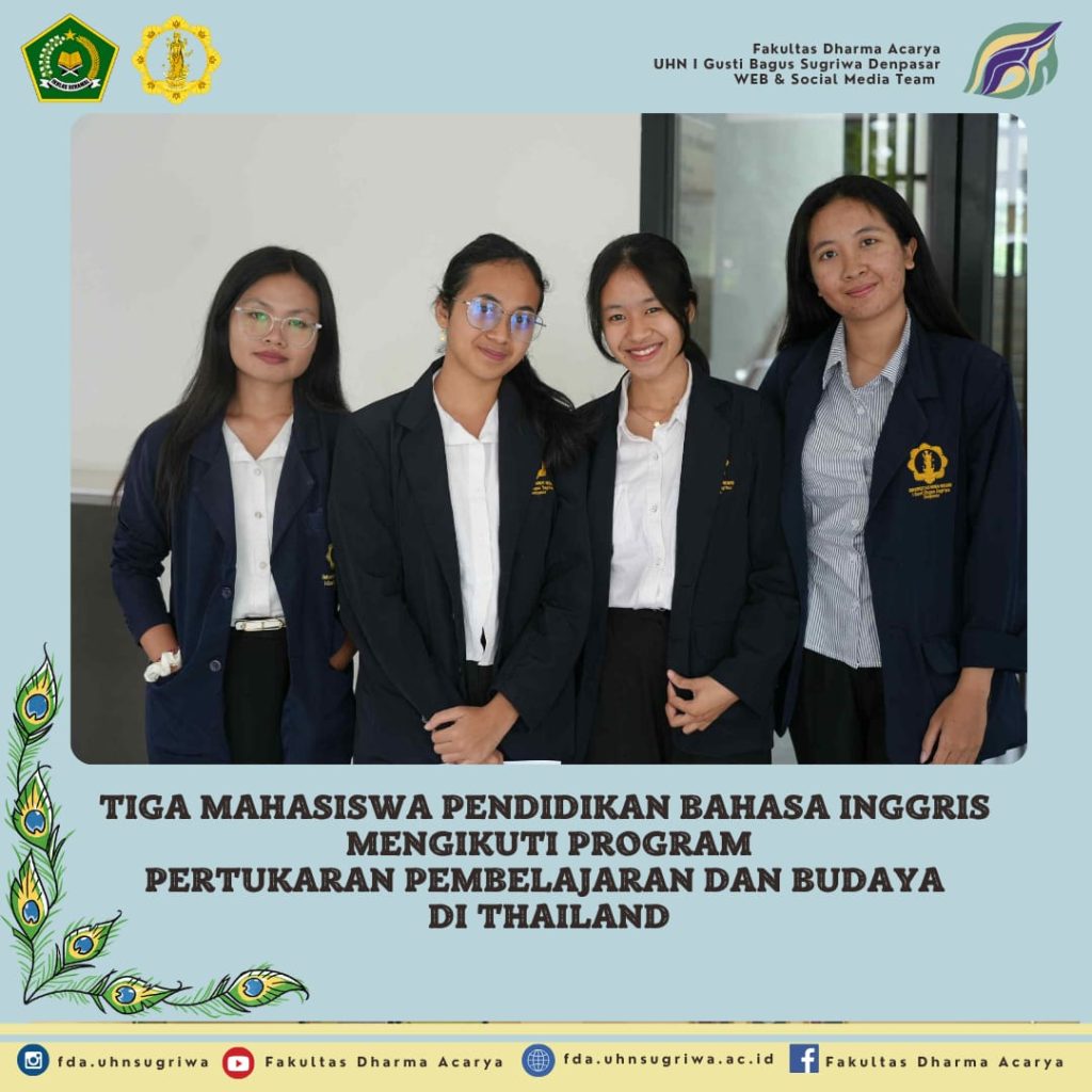 Selamat dan Sukses kepada Tiga Mahasiswa Pendidikan Bahasa Inggris yang Mengikuti Program Pertukaran Pembelajaran dan Budaya di Thailand. Jurusan Pendidikan Bahasa Inggris, Fakultas Dharma Acarya, Universitas Hindu Negeri I Gusti Bagus Sugriwa Denpasar, menyampaikan ucapan selamat dan apresiasi yang setinggi-tingginya kepada tiga mahasiswa berprestasi dari Jurusan Pendidikan Bahasa Inggris, yaitu: