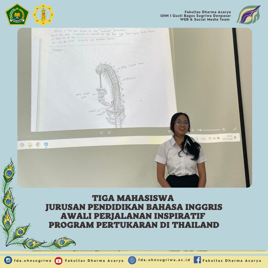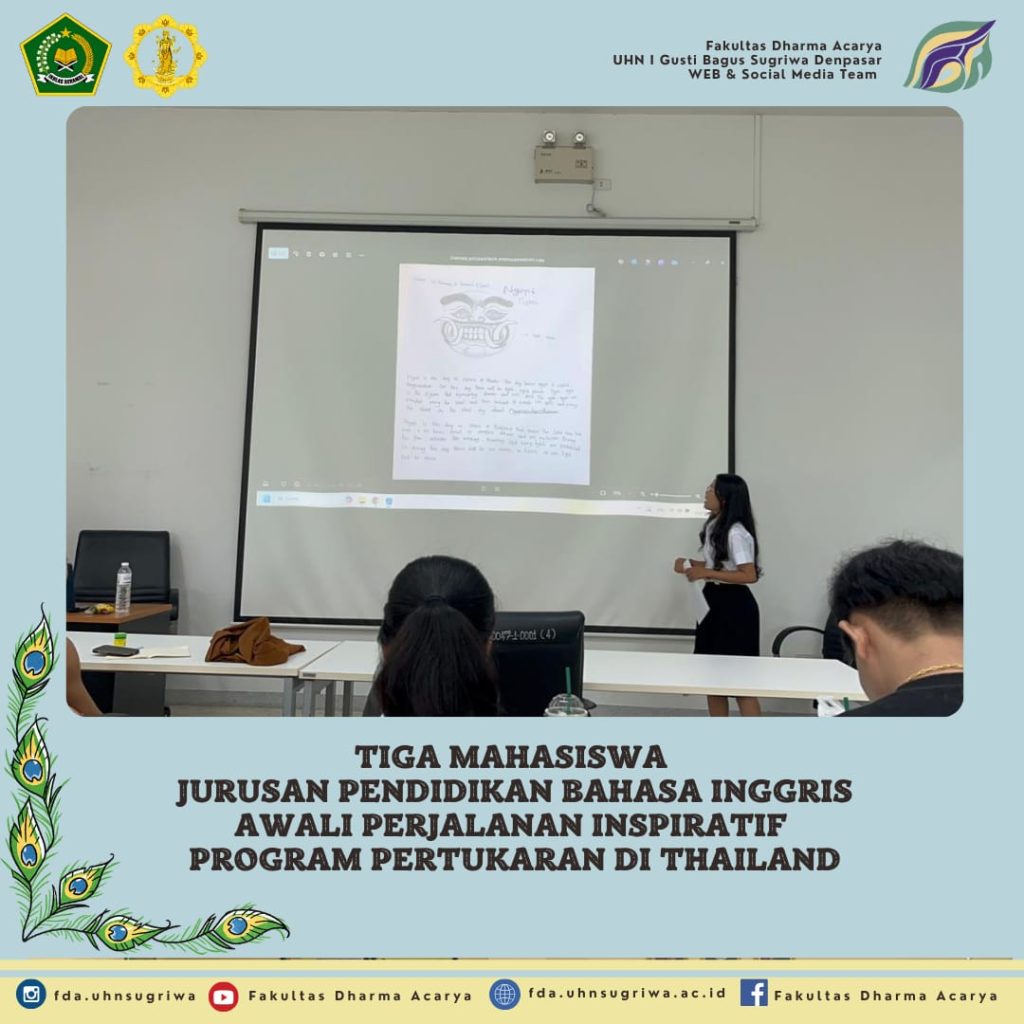Thailand, 7 November 2025 — Tiga mahasiswa Jurusan Pendidikan Bahasa Inggris, Fakultas Dharma Acarya, Universitas Hindu Negeri I Gusti Bagus Sugriwa Denpasar, melanjutkan perjalanan inspiratif mereka dalam Student Exchange Program di Mahamakut Buddhist University, Isan Campus, Thailand. Program pertukaran ini secara resmi dimulai pada 5 November 2025 dengan sesi orientasi yang dihadiri oleh Vice Rector, Director, dan para dosen pengampu mata kuliah. Dalam sambutannya, pihak universitas mitra menyampaikan selamat datang serta harapan agar para peserta dapat memperoleh pengalaman akademik dan budaya yang berharga selama mengikuti program.