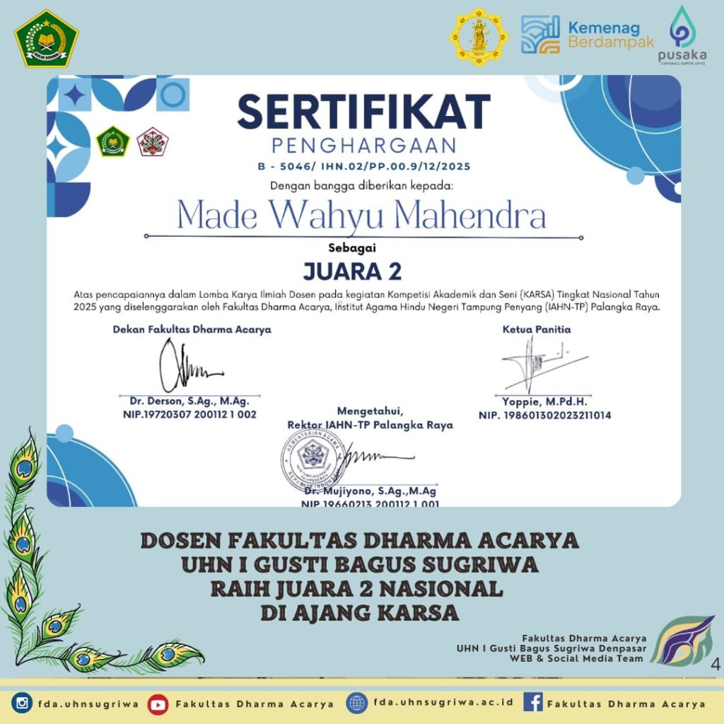 Prestasi Gemilang! Dosen Fakultas Dharma Acarya UHN Sugriwa Raih Juara 2 Nasional di Ajang KARSA