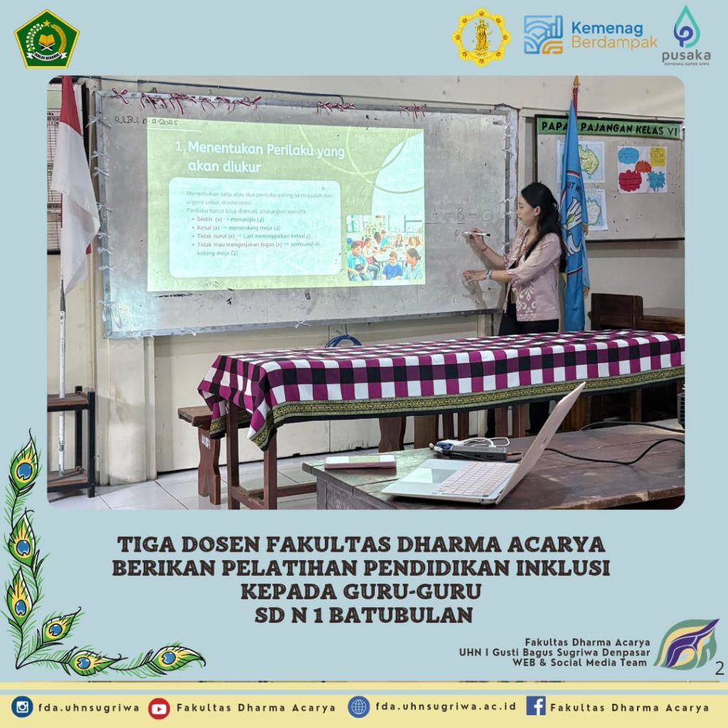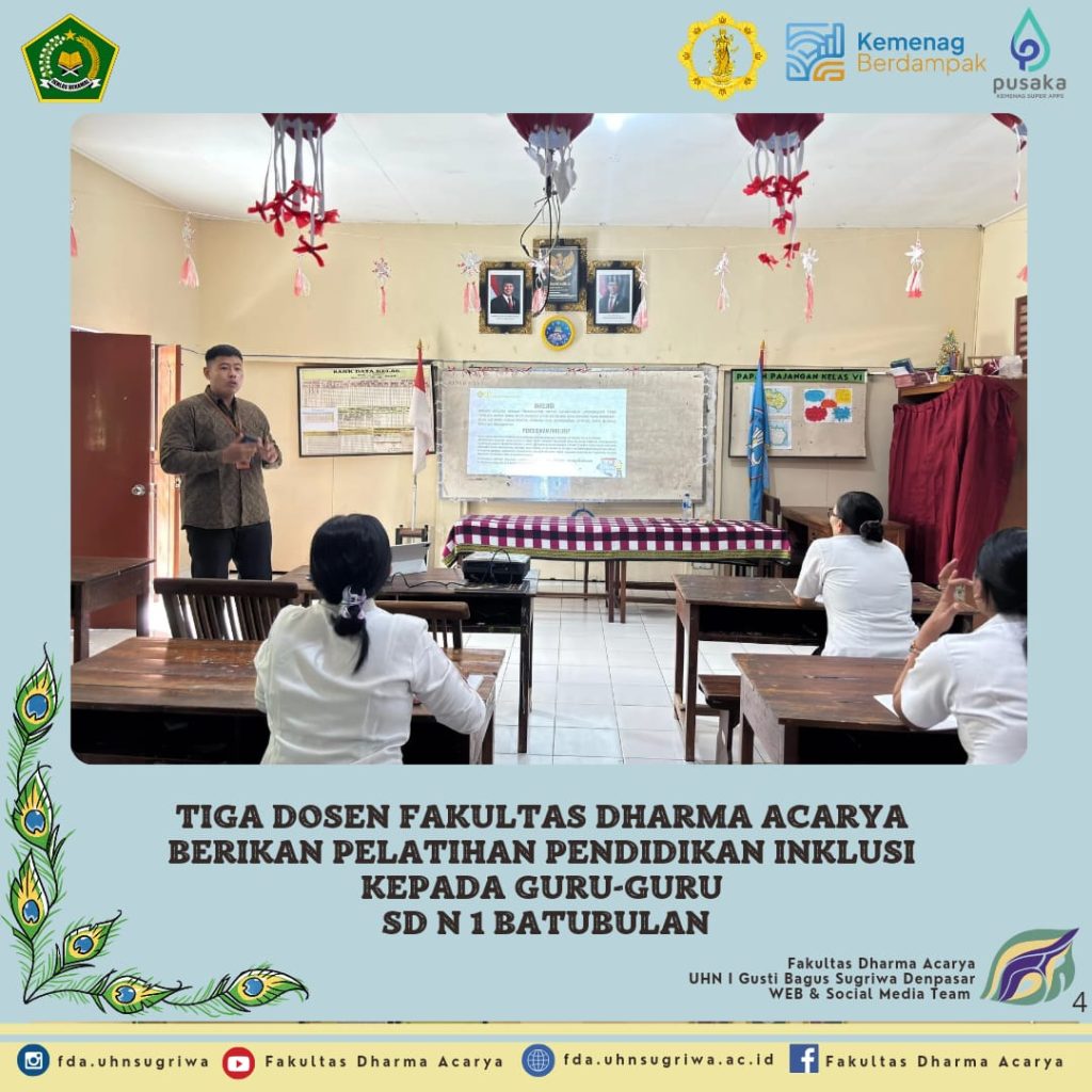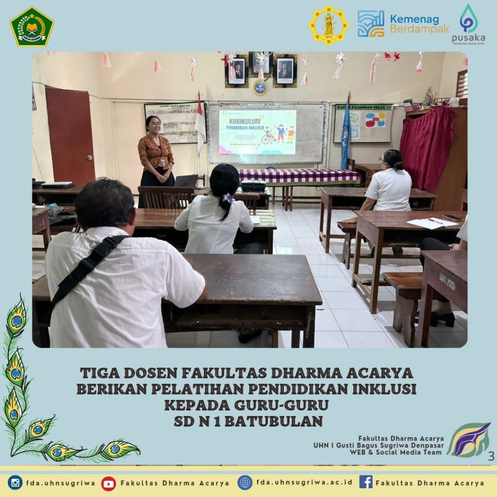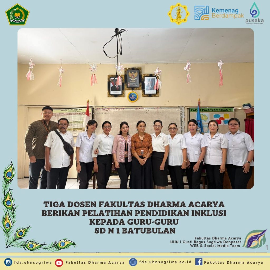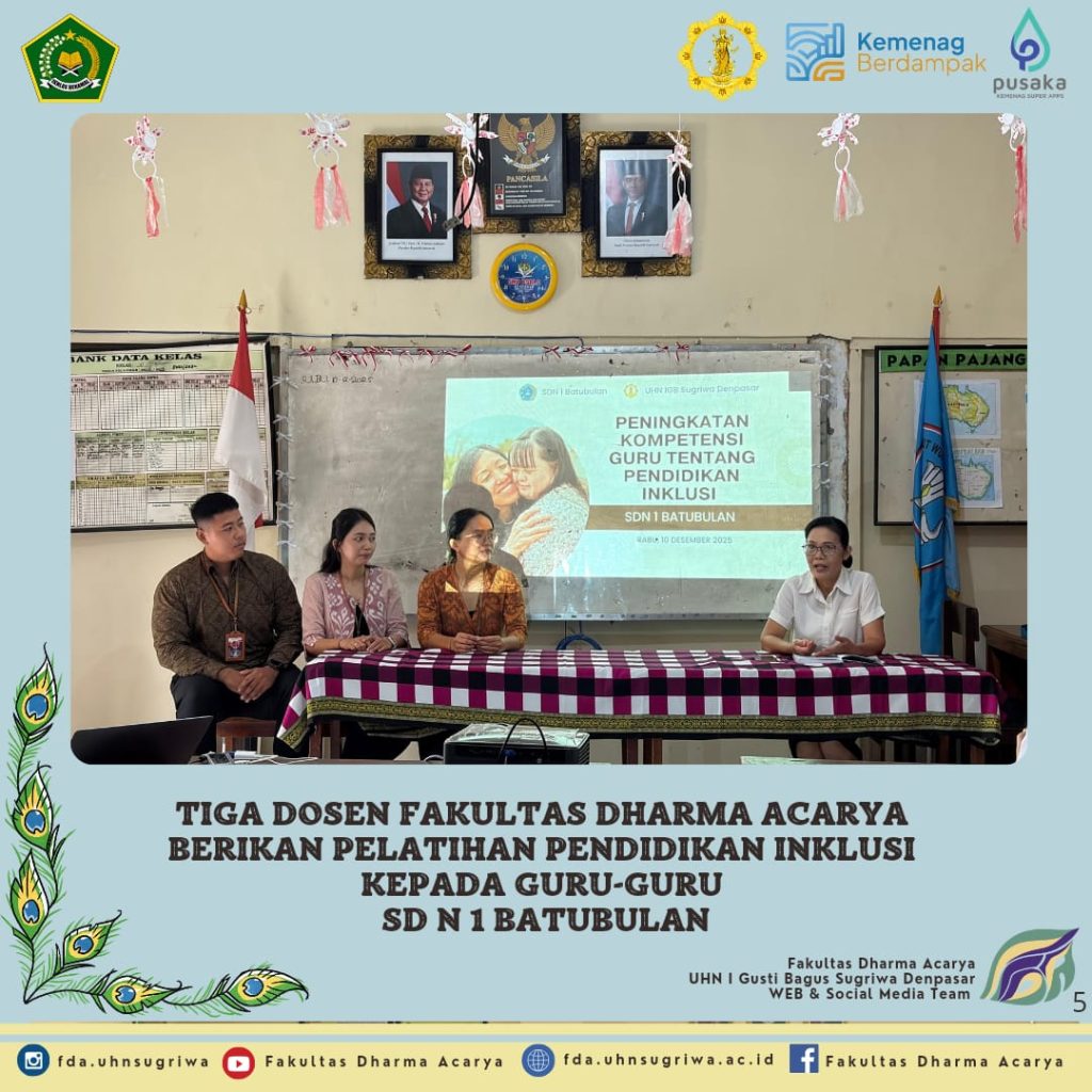Dalam upaya meningkatkan pemahaman dan kemampuan guru dalam menyelenggarakan layanan pendidikan inklusi, tiga dosen dari Fakultas Dharma Acarya hadir memberikan materi dalam kegiatan Peningkatan Kompetensi Guru di SD N 1 Batubulan pada 10 Desember 2025. Kegiatan ini bertujuan memperkuat kapasitas guru dalam menangani keberagaman kebutuhan peserta didik, khususnya dalam konteks sekolah dasar.