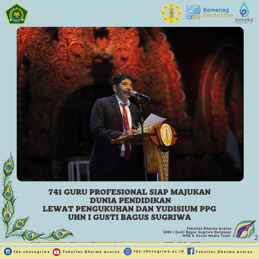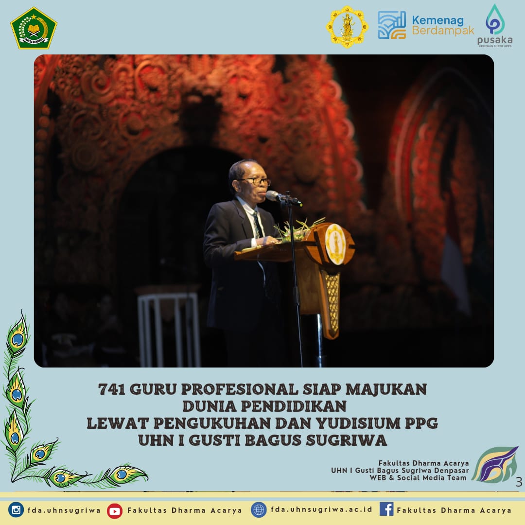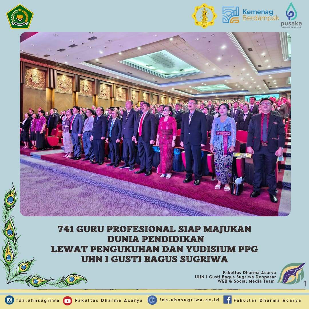 Denpasar, Bali (UHN Sugriwa) – Universitas Hindu Negeri (UHN) I Gusti Bagus Sugriwa Denpasar melaksanakan Yudisium dan Pengukuhan Guru Profesional Pendidikan Profesi Guru (PPG) Dalam Jabatan Guru Pendidikan Agama Hindu Batch III Tahun 2025 LPTK, Minggu (28/12/2025) di gedung Dharma Negara Alaya Denpasar. Yudisium dan pengukuhan diikuti total 741 peserta yang telah lulus PPG. Sejumlah 425 peserta mengikuti kegiatan dengan hadir langsung atau secara luring, sebagian lagi secara daring.